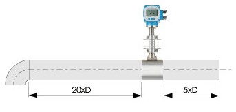 若传感器安装点的上游有90。弯头或T形接头,则:上游直管段≥20D,下游直管段≥5D
