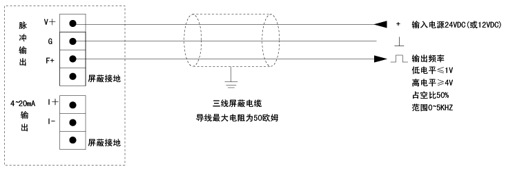 输出频率信号的流量计与其它设备之间采用三线制传输,供电电源为24VDC±10%(或12VDC),输出回路的zui小负载电阻为10KΩ,zui大电容为0.2UF。
